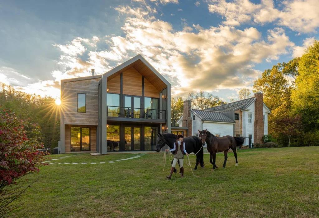 The Kozlowski Residence in Hardy, Virginia, is a transformative addition and renovation of a historic homestead originally built in the 1700s as part of the Noell Family’s “The Oaks.” Preserving the original log cabin and 19th-century farmhouse while introducing a bold contemporary volume, the project rethinks a fragmented, centuries-old house into a cohesive, light-filled family home that honors its 300-year legacy yet fully embraces modern rural living on 32+ acres